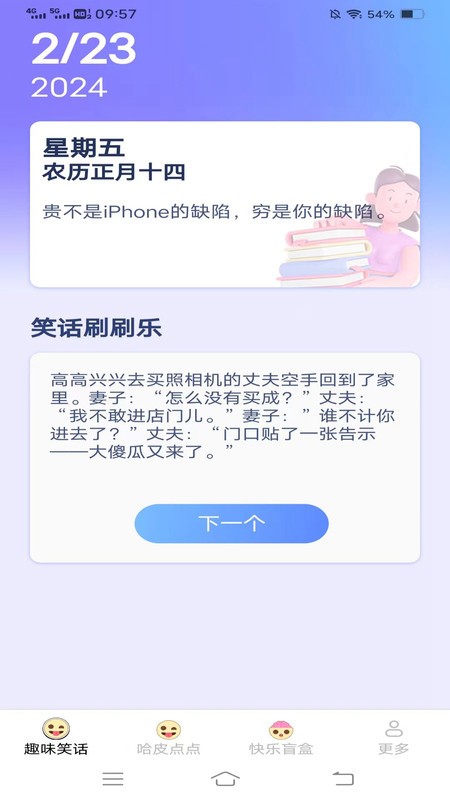 5、智能推荐:软件根据用户喜好和浏览记录,智能推荐个性化的笑话,提升用户体验。