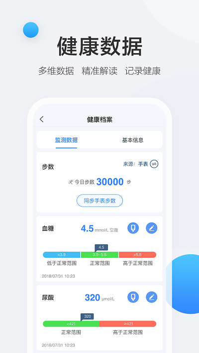 -通过APP首页“我的设备”或者首页菜单“+”接入智能健康硬件,采集用户健康数据,为用户出具健康报告,提供健康生活指导。