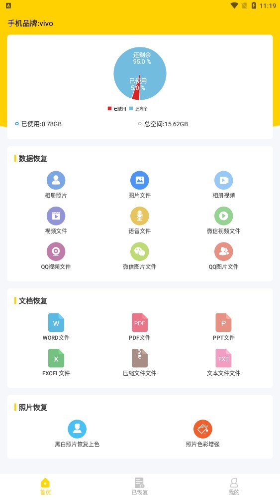 支持照片恢复、聊天记录恢复、图片恢复、语音恢复、视频恢复、文件word、Excel、ppt、pdf、txt、压缩文件等恢复。