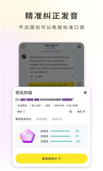 4、精准发音评分:多维度综合评估发音,精准指出问题所在,让你不出国也可以练就标准口语