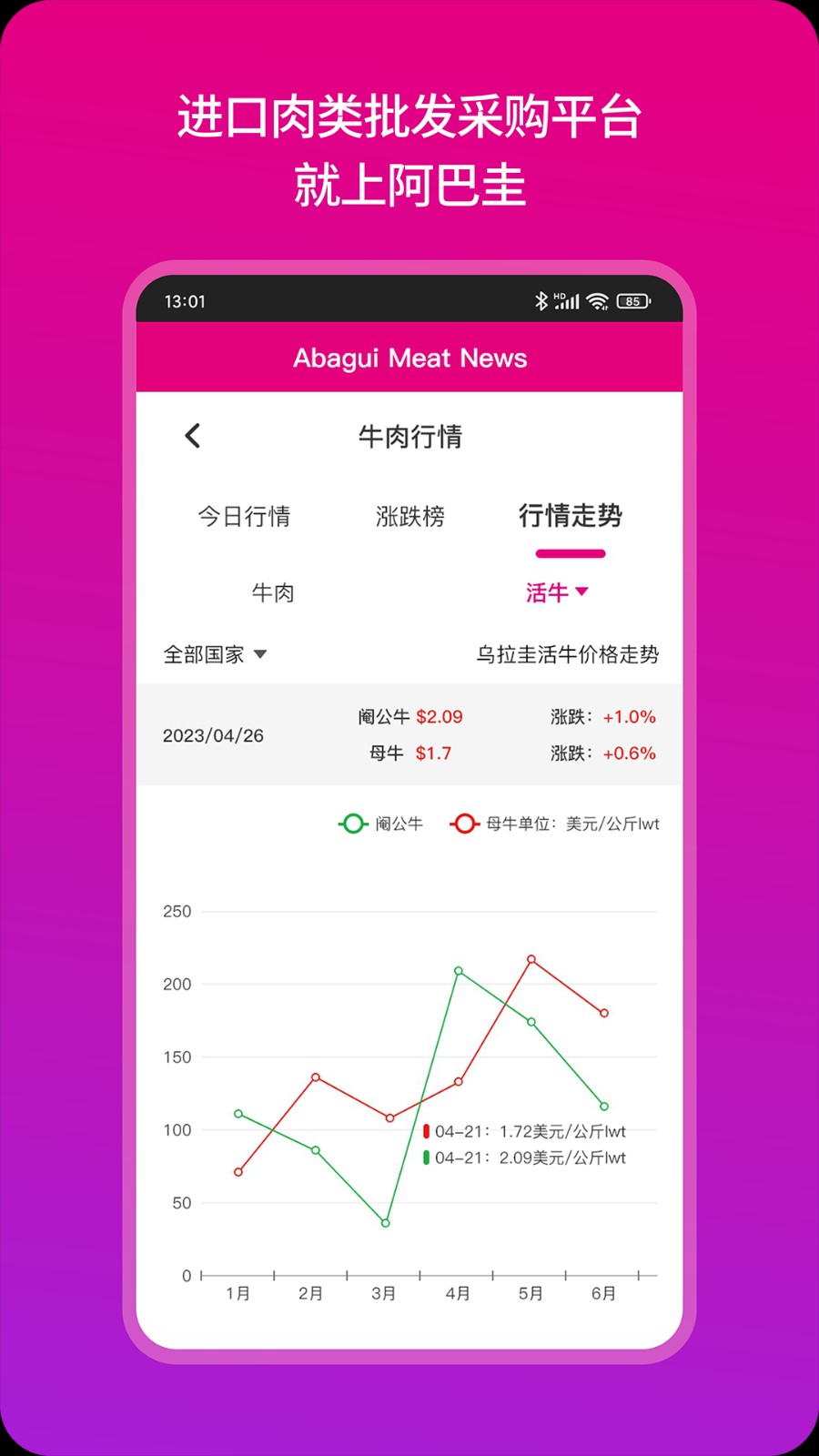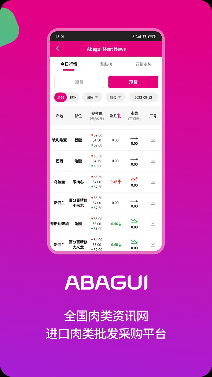 阿巴圭肉讯APP为广大用户们提供最新一手肉类资讯平台,您可以在这里查看到全球肉类价格走势、所有数据都是实时同步更新的,不管是查看行情、看资源、找货源等都可以在这里获取到,帮助用户更好地把握市场动态,提高采购效率。有需要的小伙伴们快来下载阿巴圭肉讯APP试试吧!