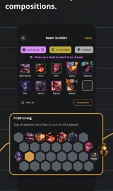 2、创建您自己的 TFT 作品并与您的朋友分享。即使您不玩游戏,也可以在与构图构建器或理论技巧一起玩游戏时提前计划策略。