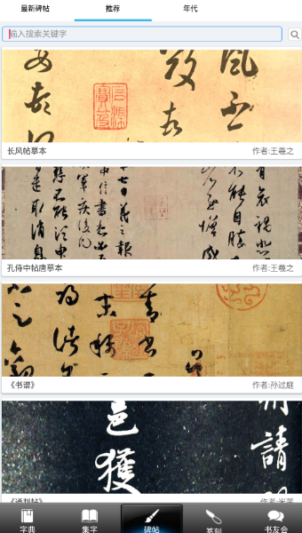 1、直接在里面查看各种书法的字帖,帮助用户了解和熟识各种书法的字体;