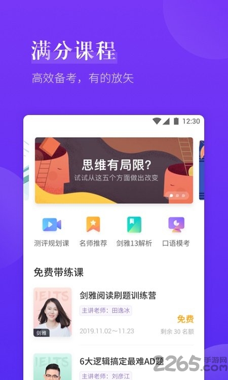 雅思考满分app是款为雅思英语考试的学子打造的学习app,涵盖了丰富的学习资源、剑桥官方题库、免费公开课,通过听说读写等多种方式练习、学习,帮助顺利通过雅思考试。精选剑桥雅思听力材料,配以英文原文,拆解成句。是为烤鸭量身定制的雅思听力9分必备应用。