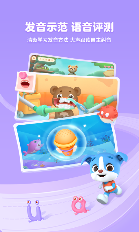 2、遵从孩子认知发展规律,以趣味场景激发孩子学习兴趣,以丰富交互支持孩子自主学习。口型示范,发音更标准;智能语音识别,及时纠正读音。