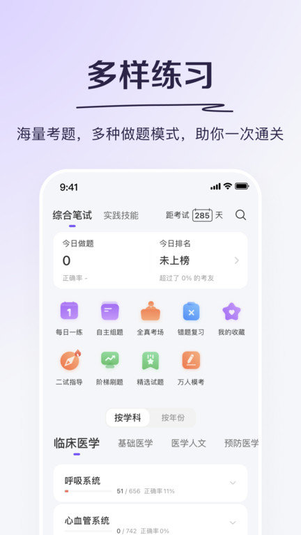 1、登录app打开软件后先选择你的备考目标,比如执业医师资格或考研,系统会智能推送匹配的每日练习题库。