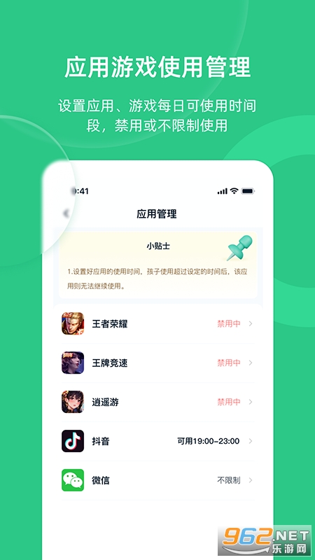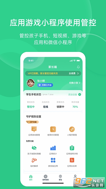 家长守护助手-家长端:专注守护5-16岁未成年人手机管控,防沉迷,引导孩子健康成长。远程控制手机使用,可隐藏学生端图标,防止卸载,可设置每日禁用时间,游戏管控可玩时间段、应用是否可使用,孩子实时定位,实时查看孩子正在使用的软件等功能。给游戏、应用限制每日可使用时间段,可禁用控制游戏,短视频、小程序等应用。家长端可以实时查看孩子手机使用动态,应用、游戏今日使用的时长。