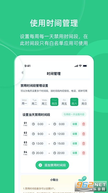 3、时间禁用管理:与孩子约定好应用或者手机使用时间,例如设置周一到周五 20:00-23:00为禁用时间段,在此的禁用时间段内,使用应用或游戏自动闪退。