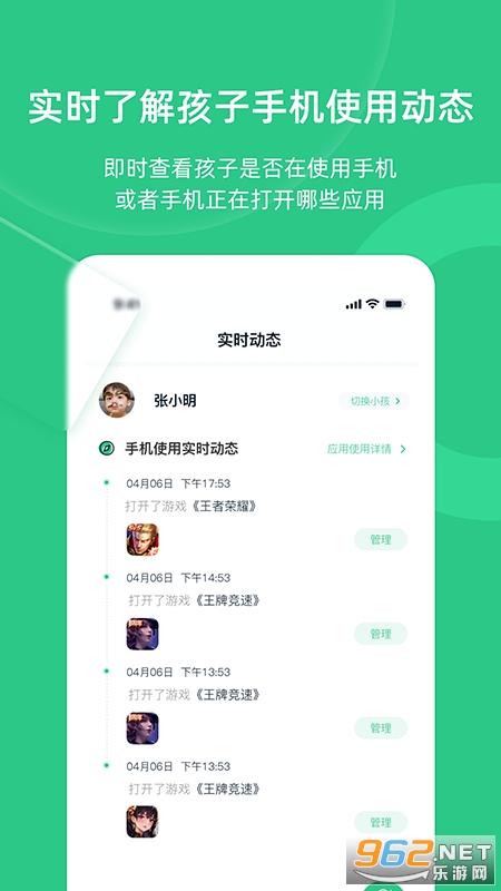 1、实时查看手机使用动态:实时查看孩子正在打开的应用,例如孩子端打开了某游戏软件,家长端实时能看到相关信息,时差在1s内。