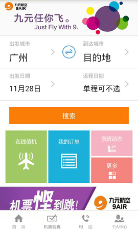 九元航空移动客户端为您提供机票预定、、航班动态查询、在线值机、在线选座、机票预约航旅服务。九元航空本着实惠、活力、有格调”的理念为您提供便捷的航空运输服务。