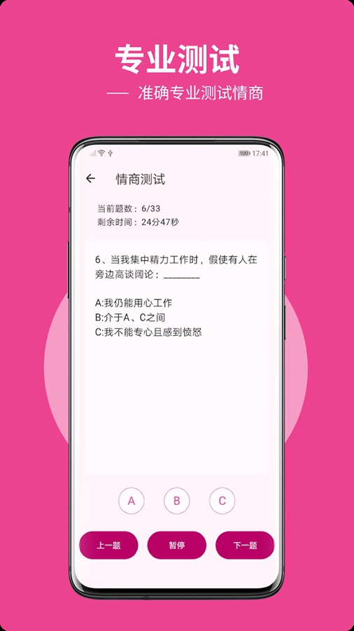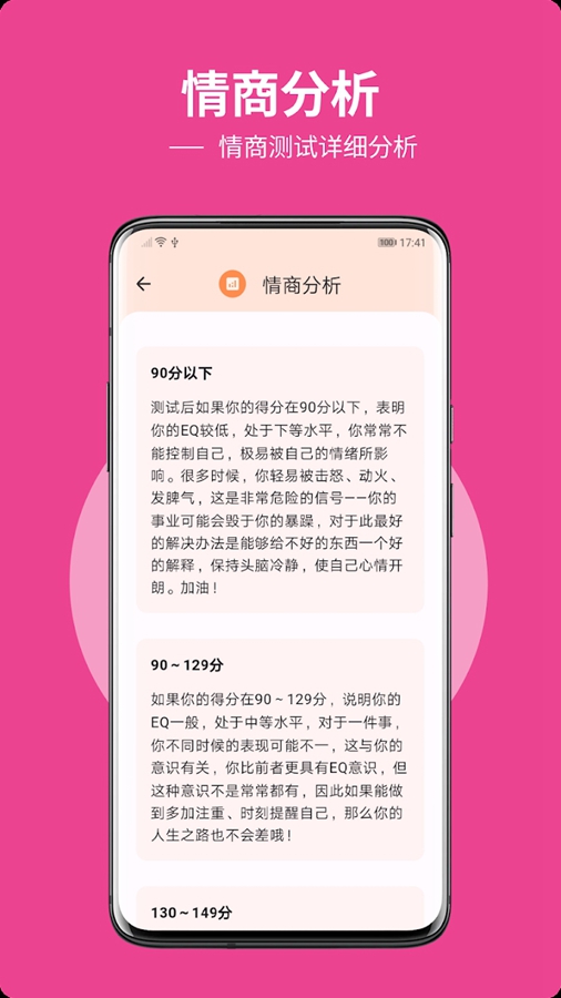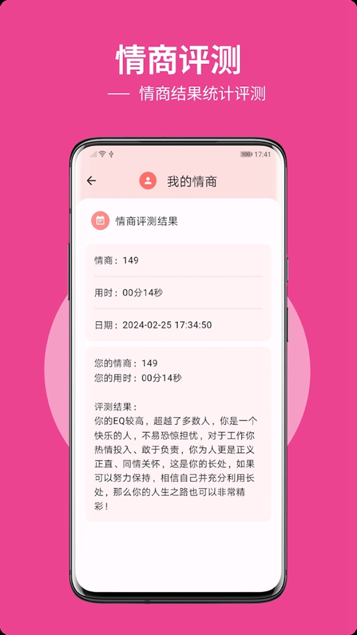《情商测试app》是一款答题测试情商的软件,汇聚了众多国际通用的情商测试题目,这些题目经过精心设计和筛选,能够全面评估用户在情绪识别、情绪理解、情绪表达和情绪管理等方面的能力。采用科学严谨的分析系统,对用户的答题结果进行深度剖析。系统会根据用户的答题情况,评估用户在情绪感知、情绪调节、人际关系处理等方面的能力,并给出相应的情商分数。