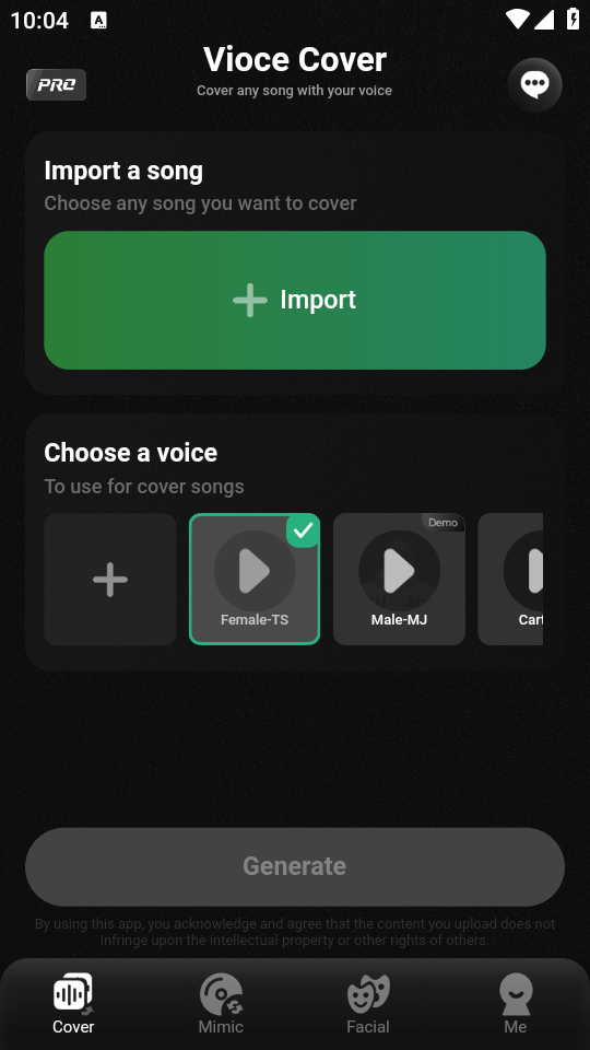 2、用户上传自己的声音,创建独特的声音模型,然后无缝替换音轨中的人声,使其听起来就像用户自己在唱歌。
