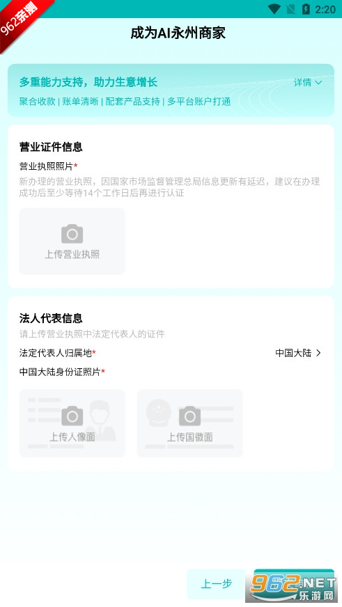 5、入驻流程相同,所需材料有:营业证件信息、法人代表信息等,上传完毕后等待审核通过,即可使用完整功能部分。