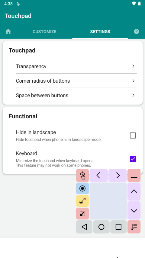 屏幕触摸板Touchpad是一款非常不错的平板电脑触控软件,非常适合广大单手操作小伙伴们使用,您可以借助该软件轻松控制桌面,类似于桌面鼠标,以及内置基础设置功能都是可以根据个人需求更改的,自由度是非常高的,实用便捷,有需要的小伙伴们快来下载屏幕触摸板Touchpad试试吧!