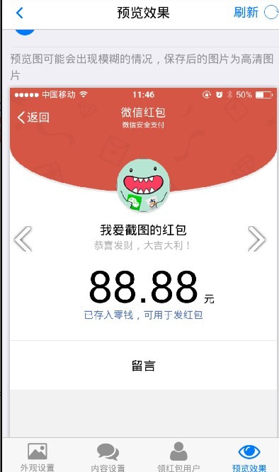 2、您可以自定义截图中的对话内容和聊天对象,还可以修改红包数量。