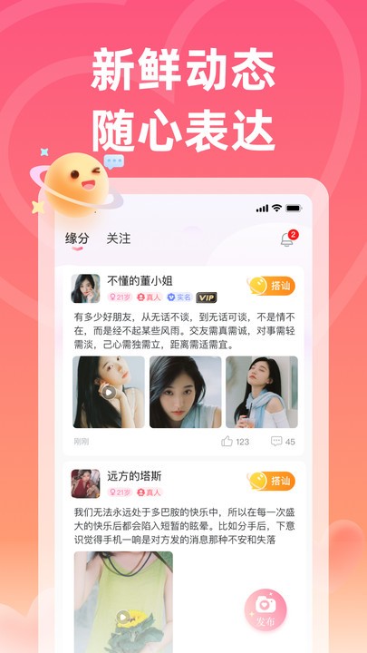 佳梦交友app是一款专为单身年轻人打造同城约会软件,能够通过地理位置服务,让用户发现周边的好友,探索兴趣相同的地方,享受同城生活。还可以为用户提供多样化的社交圈子,让用户交到更多的朋友,分享人生经验和快乐,让用户更加容易的脱单,喜欢交友的朋友不要错过哟!
