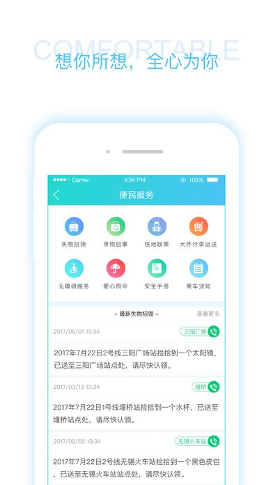 2、爱心便民服务:畅享地铁站厅内贴心服务,铁地连乘、大件行李运送、无障碍服务、失物招领、寻物启事、爱心雨伞/雨披等,享受品质地铁、幸福地铁。