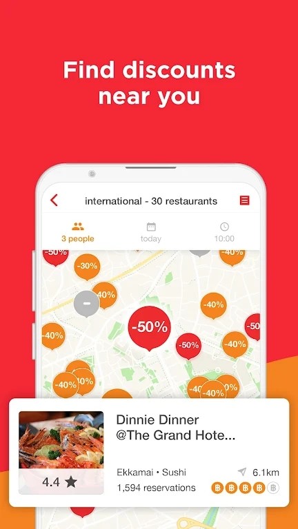 1、使用我们精选的类别、热门和新餐厅标签搜索餐厅,或使用此处和现在”功能查找附近的餐厅。