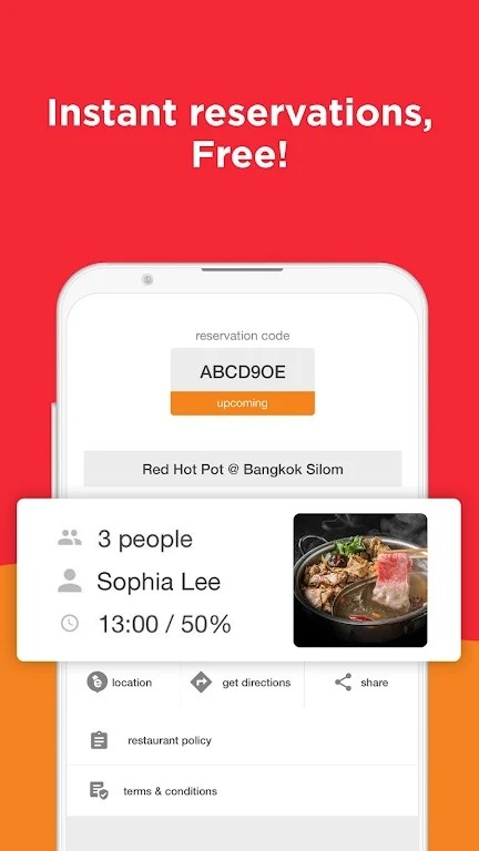 4、当您到达餐厅时,只需出示您的数字预订代码并从菜单中订购任何食物即可享受折扣(饮品除外)。您的折扣将自动从账单中扣除,您可以轻松支付。
