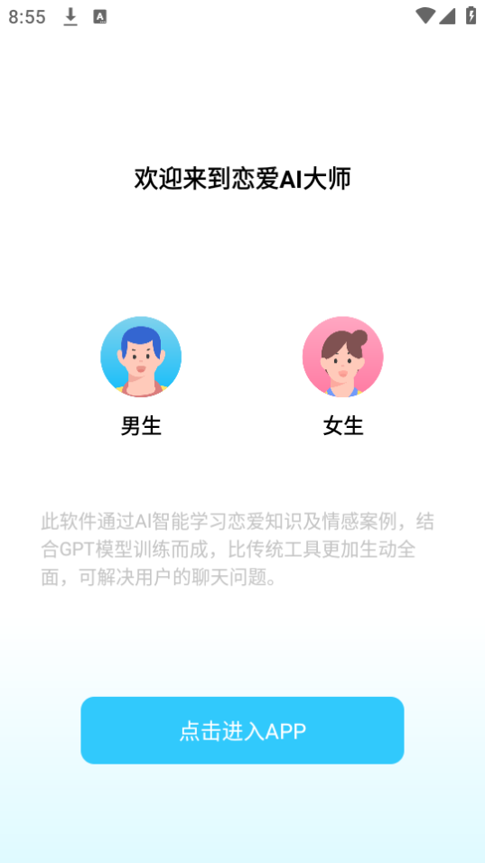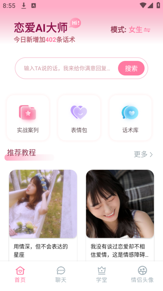 恋爱AI大师是一款非常不错的模拟恋爱聊天的软件,为广大单身男女们模拟各种实战对话、海量话术可以学习,不管是对于新手小白,还是刚恋爱的小伙伴们都是非常不错的选择,获取到非常多的恋爱小技巧,可以有效帮助感情升温,有需要的小伙伴们快来下载恋爱AI大师试试吧!
