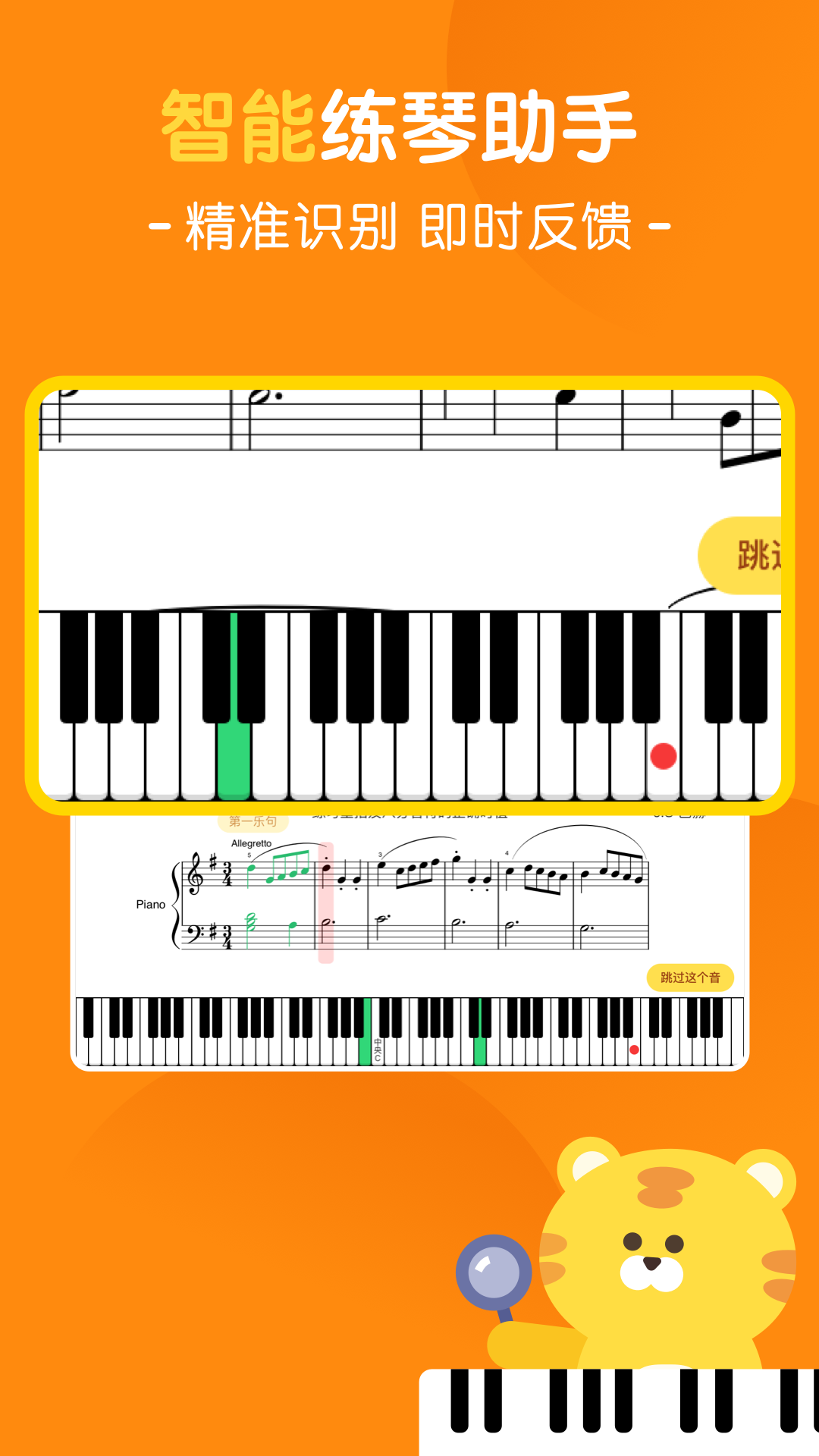 2、【准确识别 消灭错音】大猫对于弹错的音符,逐个识别即时提示。不会弹也可以跟着大猫慢慢练习,打好基础。