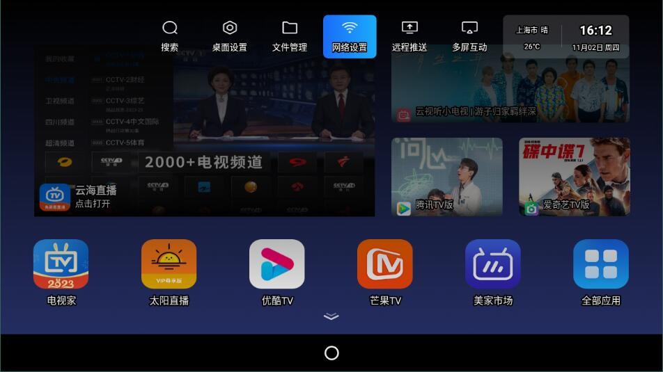 3、首页有三个最常见的功能:电视直播、电影点播、应用中心,还有几个定制地点。