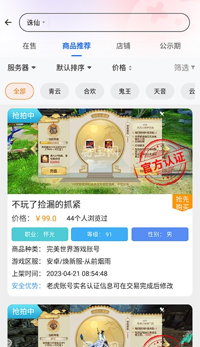 3、自由搜索关键词,就能快速找到可交易的虚拟商品,热门账号实时推荐给你。