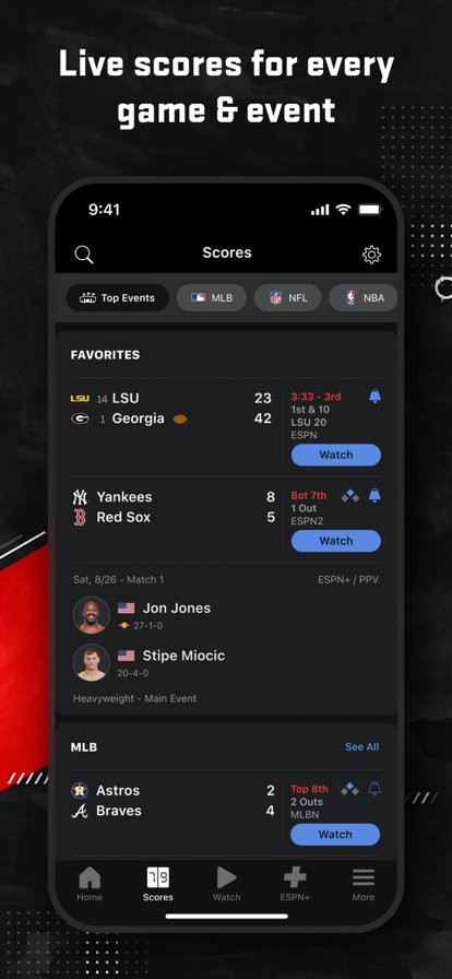 注册 ESPN+ 并访问流媒体服务,该服务提供来自世界上最好的联赛和球队的现场体育赛事。获取来自 UFC、MLB、PGA TOUR LIVE、NHL、LaLiga 和 Bundesliga、大学橄榄球、篮球等的现场赛事。