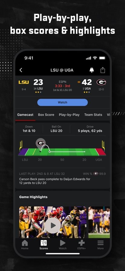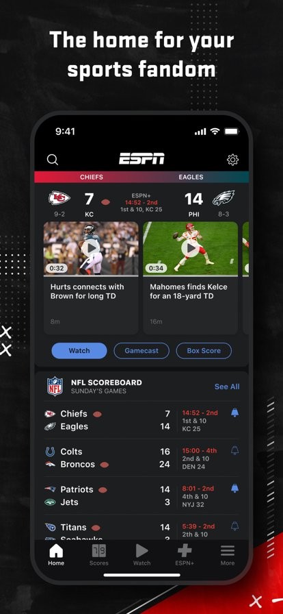 您关心的重点和分数。从关于你最喜欢的运动或球队的新闻,主页选项卡已经涵盖了你。在分数选项卡中快速访问您最喜爱的球队和联赛的分数以及当天的热门比赛。此外,订阅您最喜爱的 ESPN 播客或收听 ESPN 电台直播。