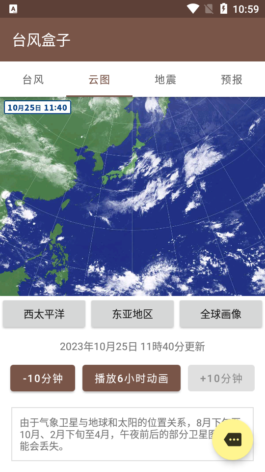1、显示10分钟前的卫星画像,区域划分为【西太平洋】、【东亚地区】和【全球】。