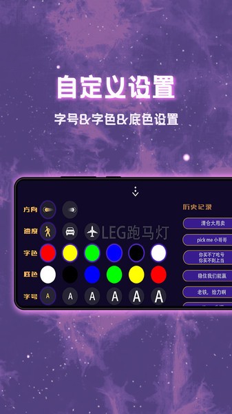 滚动led显示屏是一款特别有趣好玩的手机滚动字幕设置软件,拥有非常丰富有趣的功能,不仅可以支持自定义设置字号,字体,颜色等配置,还可以通过软件内置的小道具来进行街机摆摊,粉丝应援等多种活动,界面简洁美观,操作简单方便,喜欢这款软件的小伙伴们快来下载试试吧!