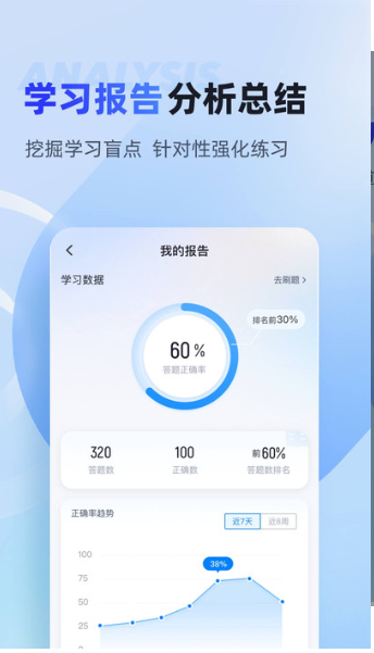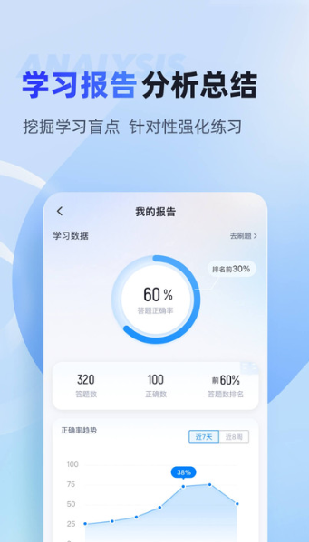 2、据用户的做题情况生成学习报告,帮助用户更好地了解自己的学习情况和不足之处,从而调整备考策略;