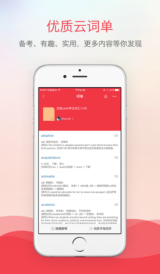 考试——增加四六级、考研、托福、雅思、GRE英语学习词典,帮助考试人群快速提升词汇量。