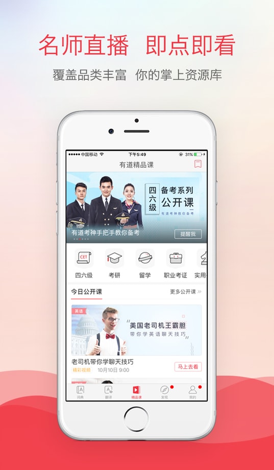 发现频道:涵盖口语、在线课程、单词本等丰富学习内容,不止是翻译这么简单。