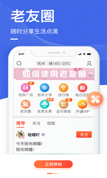1、【老友圈】与五湖四海同龄中老年朋友、志趣相同退休友人交流分享。写随笔、发照片、拍视频,记录、发现多彩中老年生活。