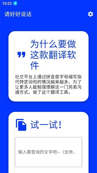 请好好说话是一款网络流行语翻译软件,可以帮助用户们快速翻译网络上各种热门流行词汇,英文缩写等都是可以轻松搞定的,翻译精准,让沟通更加简单,该软件是完全免费的,整体使用体验也是非常不错的,感兴趣的用户朋友们快来下载请好好说话app吧!
