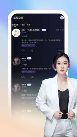 7、治愈动态:文字/音频动态,情感分享、疗愈分享、用声音传递温暖。