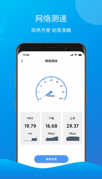 万能测速齿轮app是一款功能非常强大的网络测速软件,提供很好的优化的功能,可以实时地检测网络速度,提供下载速度、上传速度、延迟三项指标。还有很多的加速手机的功能,让你在平时上网的时候更加的快速。并且还可以利用应用的健康诊断功能,可在网络异常情况下,找出问题所在并提供解决方案。