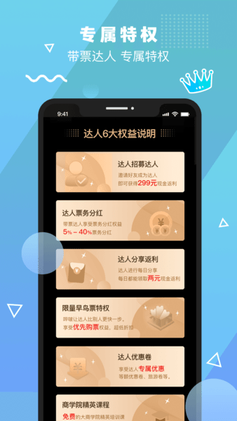 1、有各类福利特色、如低价折扣票、免费看演出等各种惊喜等你来、还支持转让票据
