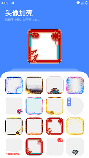 头像加壳app是一款头像美化软件,国庆节马上就要到来了,借助该软件制作国庆专属头像吧!软件内涵盖了丰富的图标壳子可以使用,一键美化打造专属个性化头像,同时也为大家提供其他特色头像壳子资源,都是可以免费获取的,操作简单,感兴趣的小伙伴们快来下载头像加壳app体验吧!