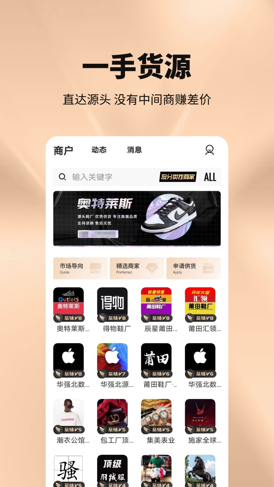 工厂货源软件是一款手机批发一手货源app。整合货源以及电商零售平台,广大小伙伴们可以根据个人店铺需求在这里进行各种货源批发、潮牌鞋服各种款式都可以在这里搜索到,所有内容都是和厂家直接对接的,提供高效沟通服务,整体使用体验还是非常不错的,感兴趣的小伙伴们快来下载体验吧!