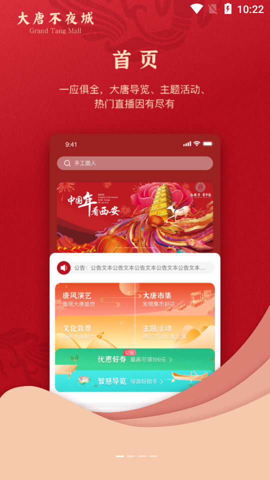 6、智慧导航:唐风演艺,市集,文化背景,主题活动,优惠好券在线购物,智慧导览帮助了解步行街;