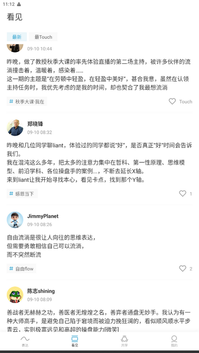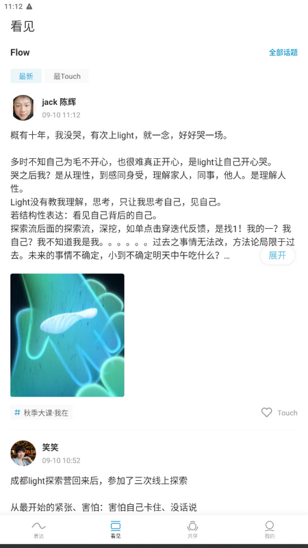 3、看见:通过"看见"功能,你可以浏览其他用户公开的表达内容,感受他们的心灵奇遇。这将给你带来更多启发和共鸣,让你意识到自己不是孤独的前进者,而是与他人一同成长的一员。