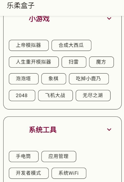 乐柔盒子nf是一款全能型工具箱盒子,为大家整合了网络上各种特色工具,经典小游戏、系统小工具等等都是可以在这里找到的,所有资源都是绿色安全无病毒的,操作起来也是非常简单易上手的,可以很好的满足各类用户日常使用需求,感兴趣的小伙伴们快来下载体验吧!