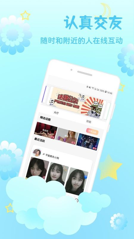 2、加入实时语音聊天室,用语音介绍自己,收听其他用户的聊天记录,随时发送弹幕加入聊天。