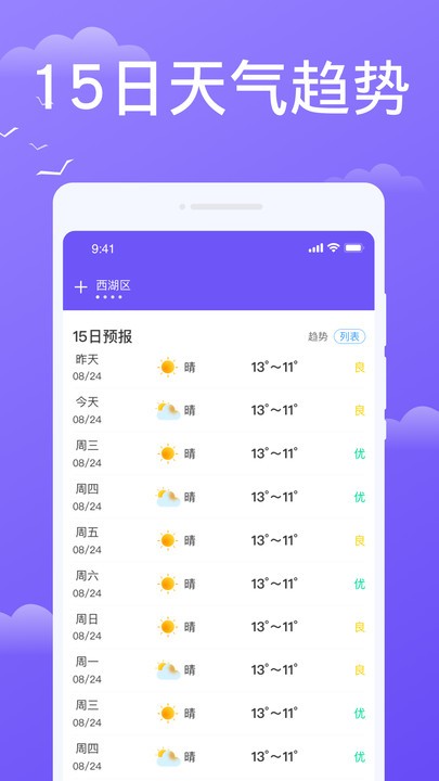 3、完整预报,覆盖未来15天天气,帮助规划生活、旅行计划。