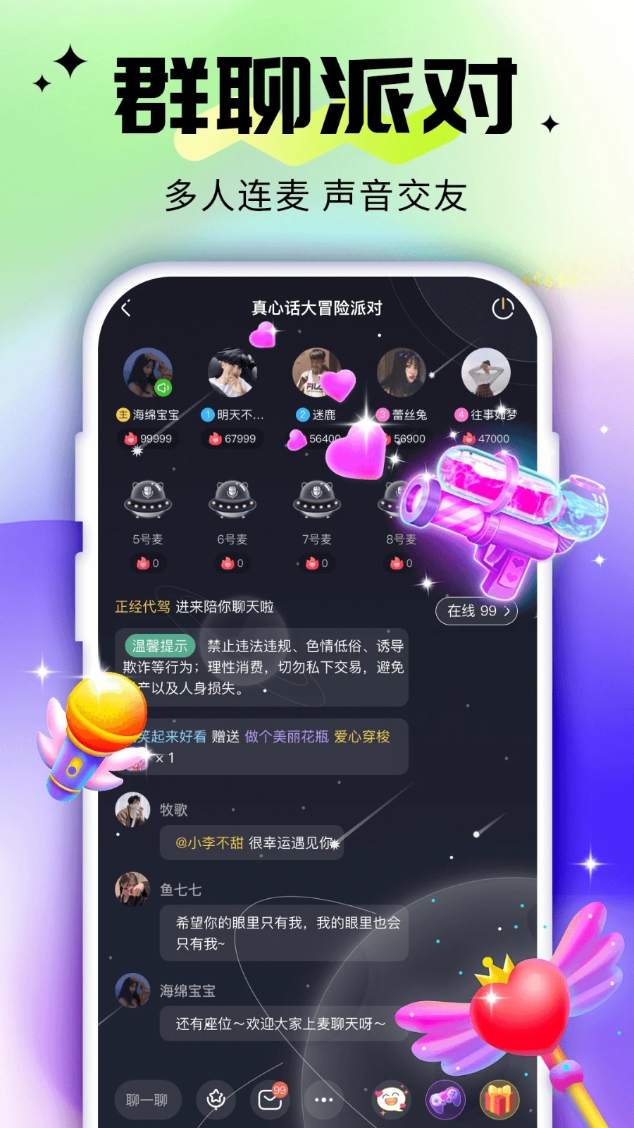 密语星球app是一款非常受欢迎的语音交友聊天软件,提供私密聊天模式保障用户个人聊天安全,您也可以在这里畅所欲言,寻找合拍的人,以及特色语音房,带给用户全新体验,多人聊天,可以找到很多声音好听的小哥哥小姐姐们,玩法多样,感兴趣的小伙伴们快来下载密语星球app体验吧!