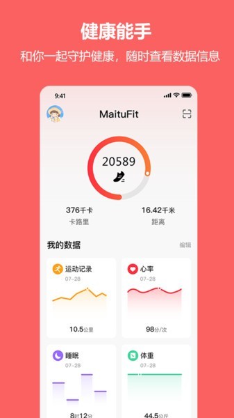 MaituFit将多维度记录心率、睡眠、体重、压力等健康指标,跟踪你的健康状况,提供科学的评估及改善建议,助你随时掌握身体变化,一起提升生活质量。