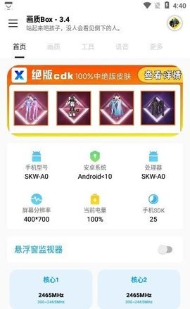 画质box和平精英是一款能够帮助玩家快速提高游戏画质的手游辅助工具,拥有非常丰富强大的辅助功能,界面简洁清爽,操作简单方便,能够满足不同用户对于游戏画质的需求,屏幕高清,让你的游戏体验更加流畅便捷,全部功能都是免费提供给用户使用的,喜欢的小伙伴们快来下载试试吧!