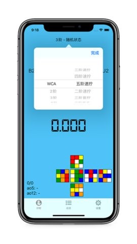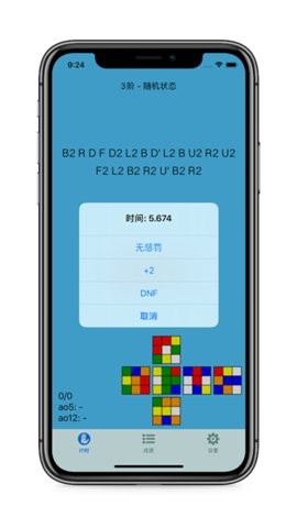 2、计时:除了常规的计时外还支持WCA观察、启动延时,每次计时结束后可确认+2/DNF,计时精确度为0.001秒;
